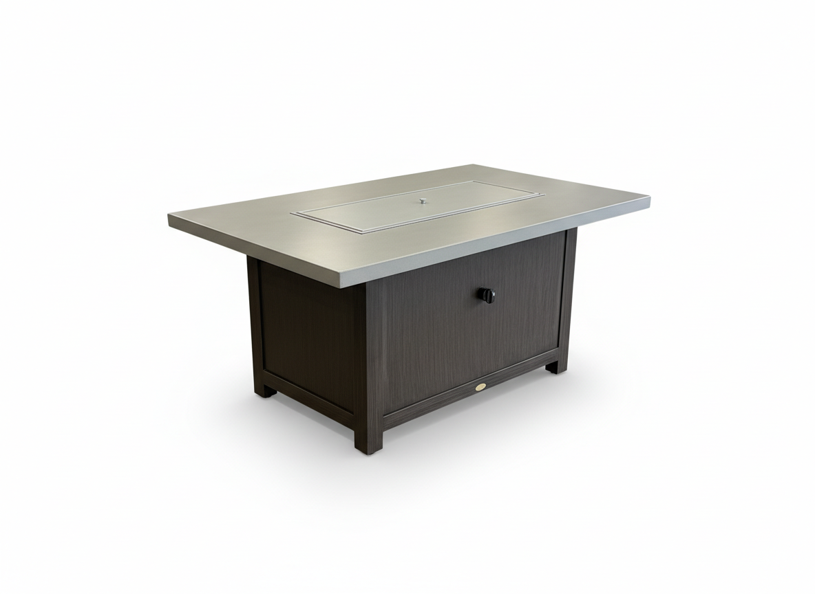 Add some ambiance & warmth to your evenings with the Luxor fire table by Ratana. Surely you’ll be dazzled by the glowing fire that dances atop a bed of fire glass. Featuring a rectangular stainless steel burner, with an optional burner lid so you can use it as a full table when the flame is off. This fire table has powder coated aluminum base with a concrete “style” top. You get the look of concrete without the weight so it’s easy to move.  No messy gas lines as the propane tank fits directly underneath it. It can also run on Natural Gas with an adapter.