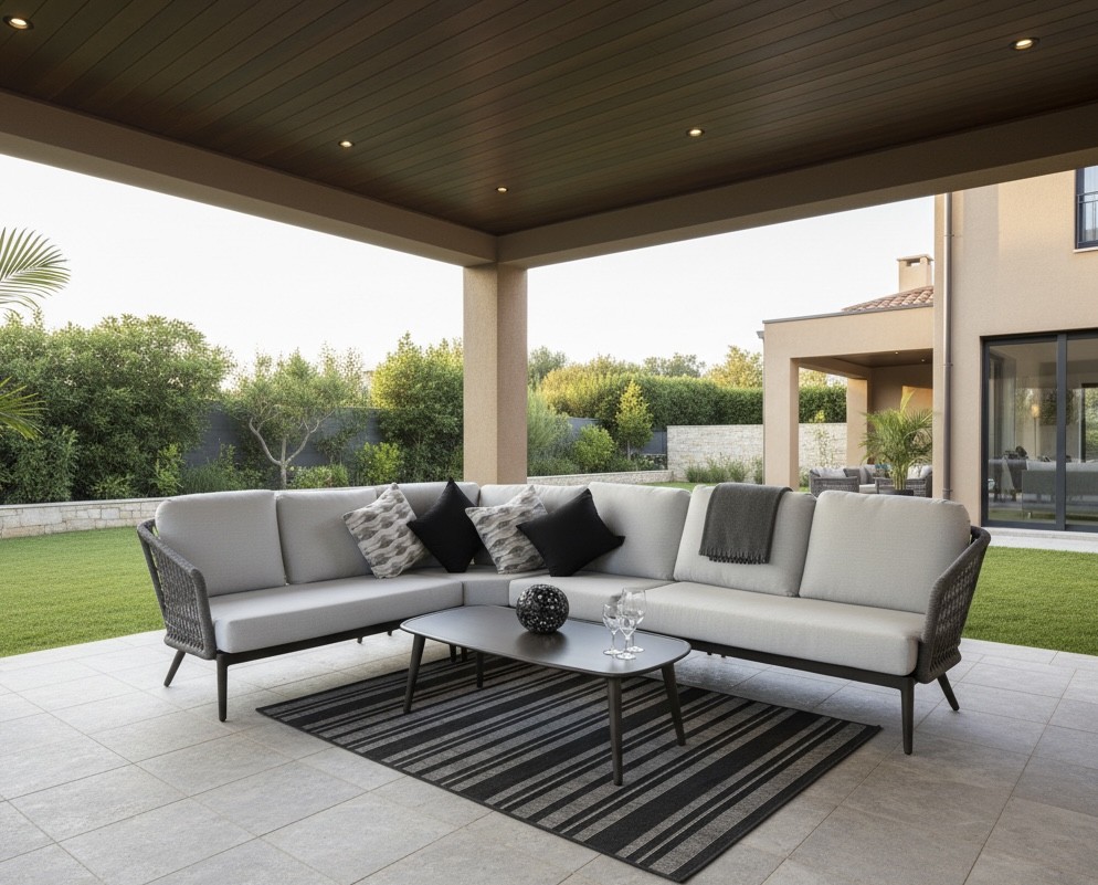 The Ratana Poinciana sectional is new for 2021. Inspired by the beautiful Poinciana tree. As such, thoughts of palm trees and warm ocean breezes come to mind with this collection. Consisting of a criss-cross hand woven rope design. Meticulously put together over a powder coated aluminum frame. This stylish collection will make you sit in style. Whether you choose from the sectional or the sofa series. As well, top quality tailoring and craftsmanship is show cased throughout. Therefore, the Ratana Poinciana collection is desired by interior designers.
